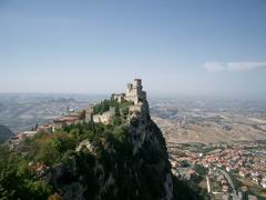 Отличный вид там открывается с горы. На смотровой площадке расставлены телескопы, но это удовольствие платное. Впрочем, и без них очень неплохо. Смутно видно Римини и море.