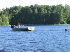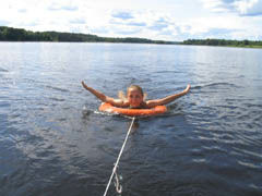 Бедная сухопутная Леська (не представляю, каким мужеством нужно обладать, чтобы отправится в лодочный поход, не умея плавать) долго не решалась вылезти за борт лодки, будучи уверенной, что круг ее не выдержит. Пришлось ей продемонстрировать, как он хорошо держит вот тогда началось веселье :)