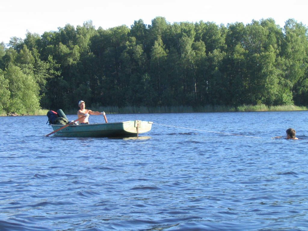 От остановки автобуса до базы всего ничего, десять минут, и мы уже там. Ещё десять, и найден Сергей. Интересно, может быть, я зазря возвожу хулу на достойного лодочника, быть может зеленый змий здесь вовсе не при чем, а дело всё в особенностях профессии, которые накладывают на человека определенный отпечаток? Кстати, ещё один замечательный кадр егерь Янек. Первая пара лодок, выковырянных из тины (штормило, лодки притопило, ага) безбожно протекали, так что мы отправились на поиски лучшей участи. Наконец, нашли пару лодок как положено, на вид ужасных, но без дыр, заполучили спасательный круг на «Бету» для сугубо сухопутной Леськи, три пары весел (одну про запас; кстати, надо отметить, что весла были хороши) и с чистой совестью отправились в неведомое. Да, лодки стоили по 150 рублей в день, каждая лодка под залог паспорта.