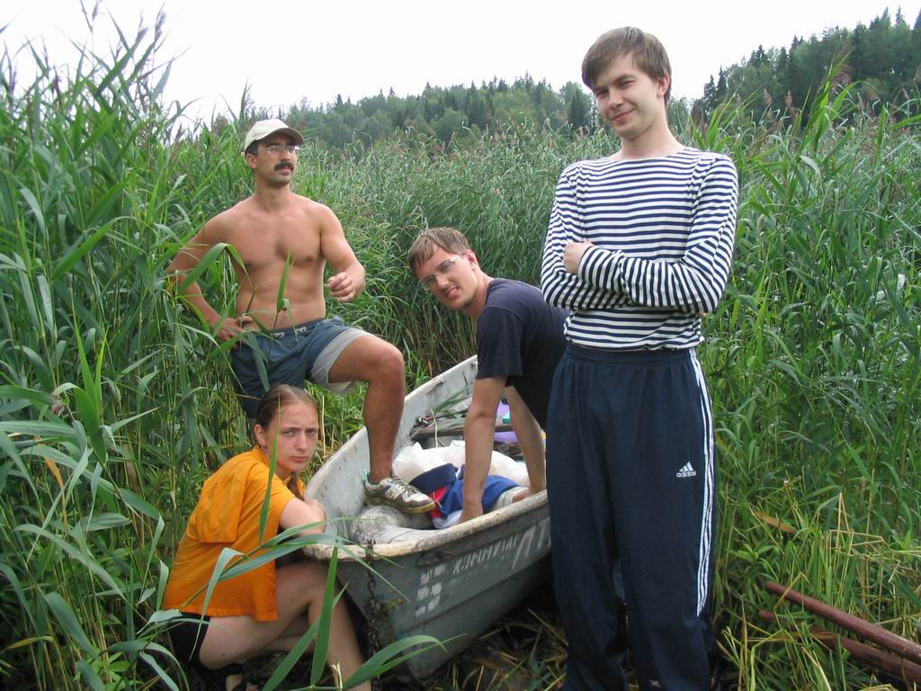 И вот мы на месте. Корявая надпись «с прибытием!» на бараке, люди, целая куча лодок на привязи похоже, что дожди полностью решили проблему нехватки лодок. Настроение не очень Димка обижен, что мы его не подождали, все хмурые и злые. Впрочем, очень скоро это проходит, и в электричке всем уже весело и хорошо!