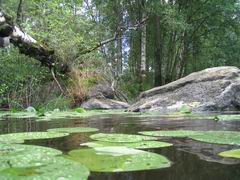 Постепенно приближаемся к Кузнечному, до него оказывается довольно далеко дальше, чем казалось при взгляде на карту. В полукилометре от платформы на берегу возвышаются какие-то песочные отвалы метров тридцать высотой, берег по большей части заросший, негостеприимный, какие-то строения догнивают в воде. Мы плывем до самого конца пролива, в кувшинки и болотные запахи всё потому, что я где-то прочитал, что прямо напротив станции должно быть удобное место, куда можно пристать (похоже, что у меня в голове каким-то хитрым образом перепутались описания подходов к Кузнечному и Приозерску). Как ни странно, но в самом гнилом углу того болота, в которое превратился пролив, действительно находится место, где можно пристать [KUZNECHNO1, 61°06,7277 N; 29°52,3485 E] и тропинка через лес к станции. Берега топкие, жестоко воняет в общем, не надо там приставать, есть куда как более удобное место, пусть от него и не так близко идти. Лучшее место мы нашли на обратном пути, на шестой день, а пока удовольствовались этим.