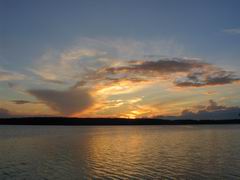 Я видел сильные ливни на юге. Такие ливни, которые идут минут десять, но за это время успевают вырыть на дорогах целые канавы и надолго замутить море. Так вот здесь был такой же ливень с тем только отличием, что он не прекращался и не прекращался! Одежда мгновенно промокла, и даже то, что я успел всё с себя стащить и запрятать в пакет, меня не спасло вода забралась и туда. Ветер разгонял капли так, что они ощутимо больно били по коже, по ощущению и производимому звуку куда более похожие на град, чем на дождь! Вода в лодках прибывала быстрее, чем мы успевали её вычерпывать, а тут ещё и гроза подобралась совсем близко; мы развернулись к ближайшему берегу и уткнулись в тростник. Всё промокло. Включая рюкзаки как мы их не прикрывали. И нам было, в общем-то, уже наплевать! Мы вспомнили про пиво и выпили его только что мороженое есть не стали с дождем пришел и холод. И так мы стояли под ливнем, ощущая на себе всё буйство стихии, и постигая его во всей возможной для нас мере. Мы орали, пели всё это терялось в шуме дождя, и это было так здорово, что передать это совершенно невозможно!